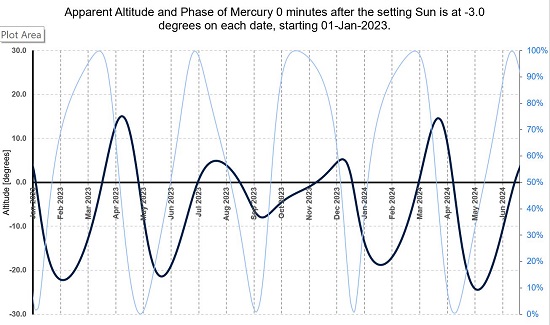 the Sun is 3 degrees below the horizon. They also show, in light blue on a scale from 0 to 1 (0% to 100%) the phase of Mercury, i.e. how much of a crescent or